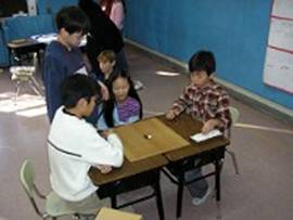 日本の遊びを紹介しました。めんこ、福笑い、五目並べ、だるま落とし、かるた、百人一首、けん玉、羽根突き、こま、など、はじめにその遊び方を英語と日本語で紹介し、現地校の子ども達がそれぞれ「やってみたい」遊びを選びました。学校の福笑いとコマをお土産にもらい、とても嬉しそうだったアメリカ人の子ども達の顔が印象的です。ちなみに、この日本の遊び道具、4年生が手分けしてお家から持ってきたり、幼児部から借りたりして揃えたそうです。