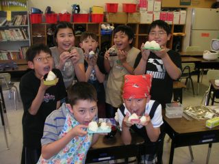 5年生最初の調理実習は,おにぎり作りでした。食べることと遊ぶことの大好きな5年生にはぴったりの学習でした。最初の1個は,手につくご飯をとることで一生懸命で,出来上がったおにぎりよりも,手についたご飯の量のほうが多いくらいでした。2個目となると上手にできるようになり,見違えるようなできばえでした。昼食で,自分の作ったおにぎりを食べて,「家でも作ってみよう。」「三角に作るのは難しいなあ。」とみんなで話しながらおいしくいただきました。5年生は,これから学級園に田植えをして,お米を作ることから始めます。食べることが大好きな5年生が,食の大切さを学校中に発信できるように取り組み始めています。 |