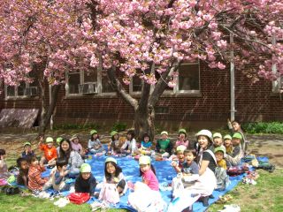 4月の終わり頃、園庭の桜が満開となりました。日々つぼみが膨らみ、ピンク色が濃くなっていくのを見て、開花を心待ちにしていた子どもたち。お弁当を持っ て、桜の木に集合!お花見昼食会をしました。1回目は、クラスのみで。2回目は、チャイルド・ケア部門”きりんのへや”と。3回目は、幼児部3学年合同 で。年長児としての自覚たっぷりのひまわり組は、年少児への気配りも忘れません。お弁当を開けるのを手伝ったり、食べさせてあげたり。いつも仕事を探して くれます。数日後、あっという間に散って、緑だけになった木を見て、叫んだ子がいました。「うわあ、桜が散ったら、夏になっちゃった。」そのまた数日後、 本当に真夏日がやって来たのでした。NYの春はとても短いです。 |