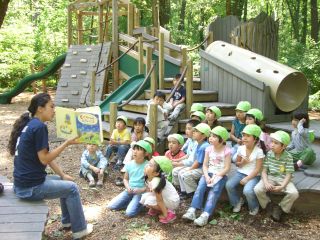 初夏の晴れた日、自然保護林を有する、近所の Nature Center へ森歩きに出かけました。戸外遊びの充実と、自然に親しむことがねらいです。「森の探検隊、しゅっぱーつ!」シマリス、クモ、背の高い木、腐って穴の開い た木(「おじいさんの木」と子ども達は名づけました)、カメなど、色々な生き物を見つける度、興奮して教え合いながら歩きました。1時間ほどトレイルを歩 き、水の透き通った小川に寄り道もして、ピクニック・エリアに着いた頃には、おなかがペコペコ。新緑に囲まれて食べるお母さんのお弁当は、一味違います。 森の中で見つけた音を使って「あぶくたった」をしたり、日ごろお部屋でしているように絵本を聞いたり。身体一杯に自然の力を受け、とても清々しい一日でし た。また季節が変わる頃、出かけたいと思っています。 |