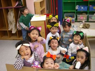 すみれ組には、フェルトの耳としっぽがたくさんあります。4月より、泣く子もこの耳をつけると「ニャ~」とネコに変身し、遊び始めることのできる魔法の耳です。ネコの旅行、学校、パーティ、冒険など。日々いろいろなストーリーが生まれては消えていきました。ある子が色紙を切って「ネコのご飯だよ。」と魚を作り、新聞紙の棒を作っていた子がそれを見て「釣りをしたい。」と言い出して、釣りごっこが始まったこともありました。自由にばらばらに遊んでいるようでも、いつしかクラス皆が同じテーマの遊びをしている・・・という場面が何度も生まれました。友達が気になるのですね。面白いアイディアは真似して取り入れたり、「い~れて。」と仲間に入ったり。遊びが発展すると同時に、集団の関係も深く大きく変化している1学期です。 |